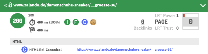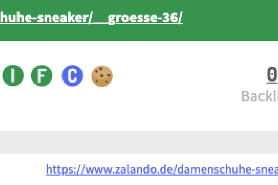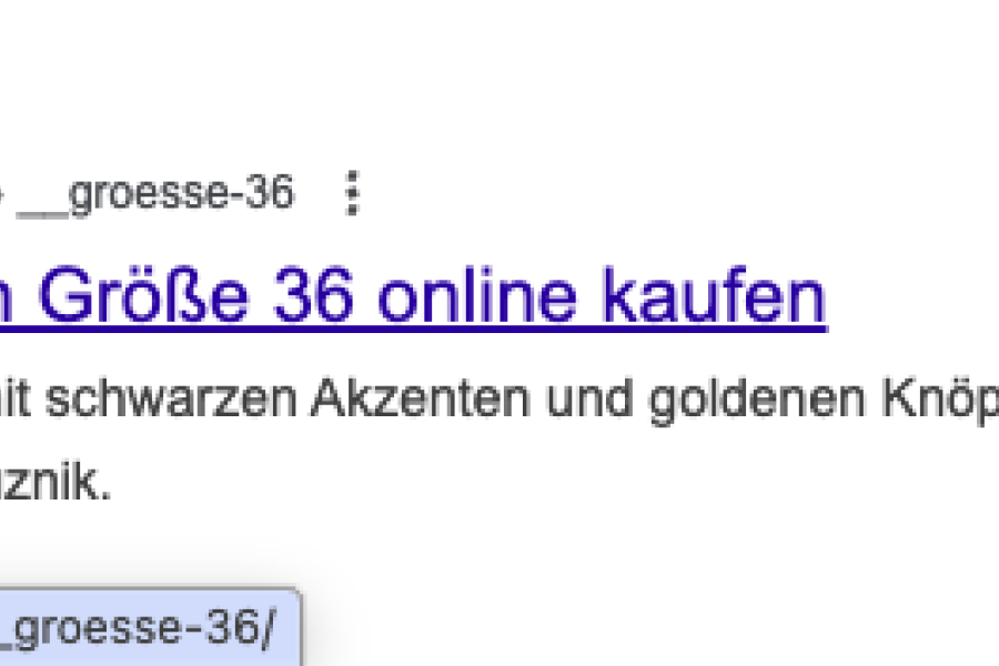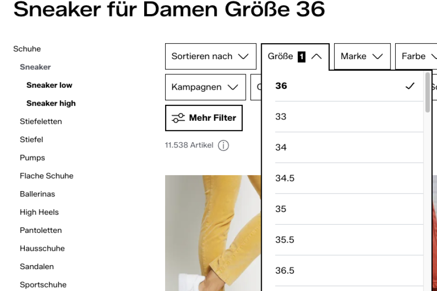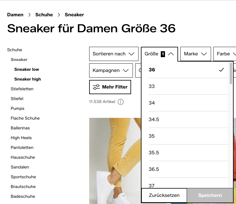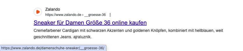 Hier ein Beispiel von einem Big Player im Mode Bereich. Filterseiten werden zur Indexierung freigegeben. "Sneaker für Damen Größe 36" - Der Titel ursprüngliche Titel der Kategorie "Sneaker für Damen" wird um die "Größe 36" ergänzt. Die Filterseite erhält einen selbstreferenzierenden Canonical Tag sowie Meta Title und Description.